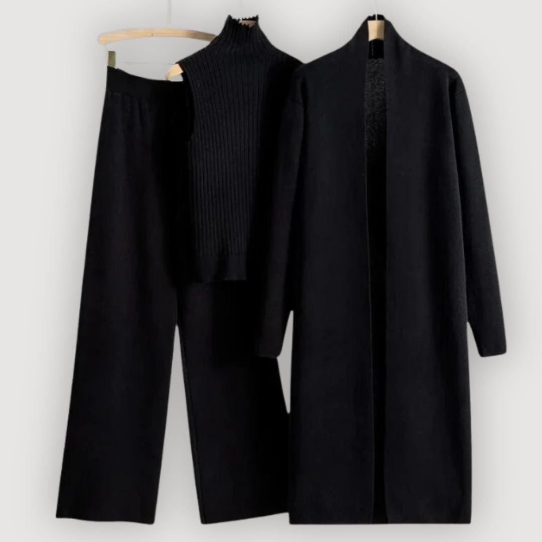 Stay effortlessly chic and cosy with the Elena Knit Lounge Set. This three-piece set includes wide-leg trousers, a ribbed sleeveless top, and a long open-front cardigan for the ultimate in comfort and versatility. Perfect for lounging at home or stepping out in casual elegance, it’s a must-have for a modern wardrobe.